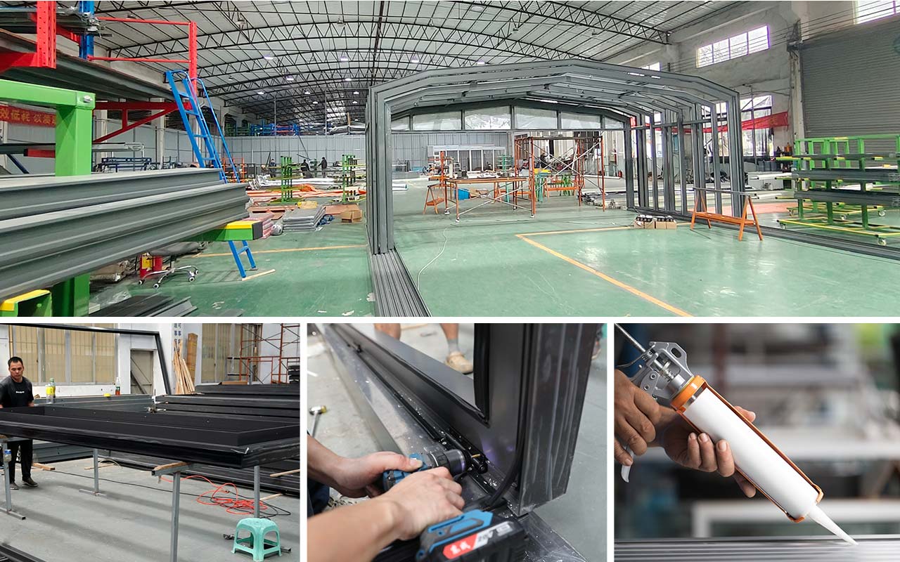 The total area of the assembly workshop is 11,000 ㎡, with 80 technicians and standard production processes. It only takes 1 day from assembling the frame, installing the sealing strip, installing the glass panel, fixing the glass to testing and debugging. The product pass rate reaches 99%, and the monthly production capacity reaches 125 sets of skylights.
