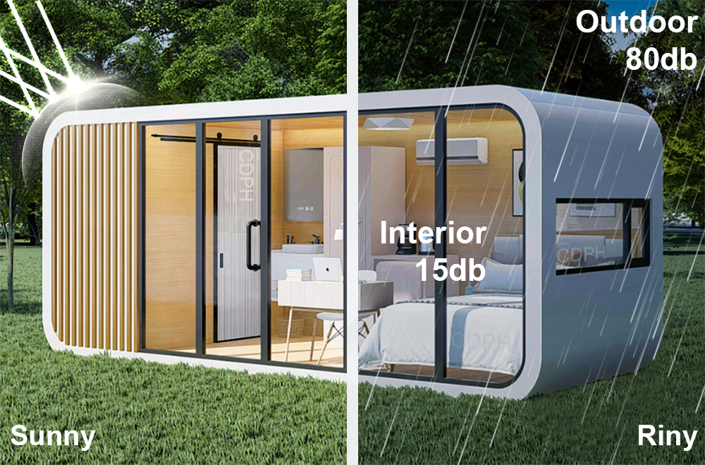 The capsule is designed with a multi-layer structure: the outer shell is made of aluminium veneer, which is sturdy and durable; the middle layer is insulated rock wool, which is highly efficient in heat insulation; and the interior is made of carbon-crystalline panels, which has an elegant texture. This combination ensures the capsule’s robustness, comfort and modernity, and is the perfect embodiment of high quality and innovation.