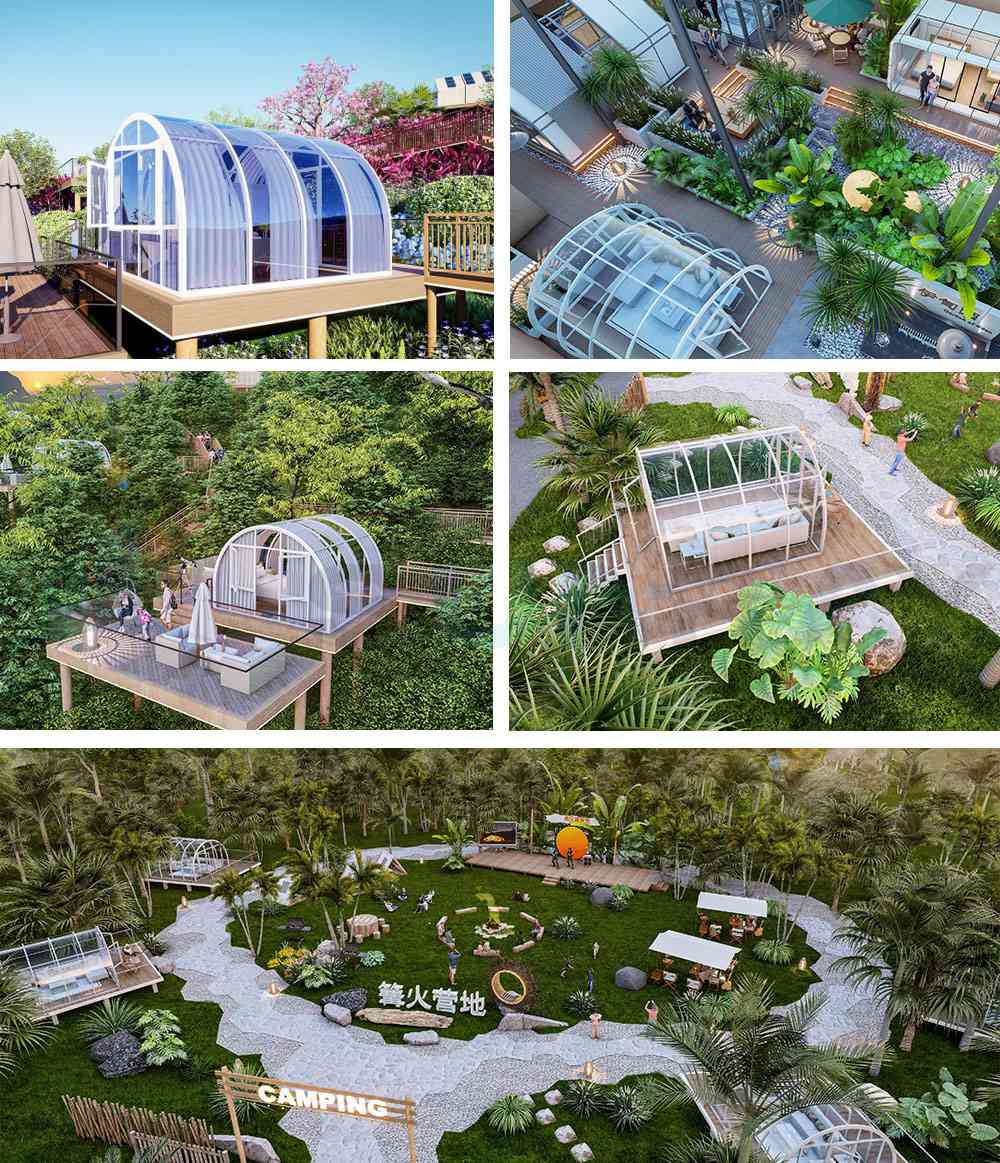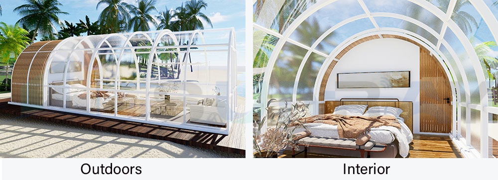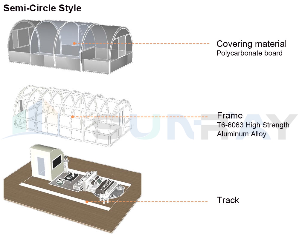 1. T6-6063 aluminum frame + polycarbonate board: 16.8㎡ (52㎡ expanded) semi-circle design, includes lighting/shading/1+2 window-door systems.