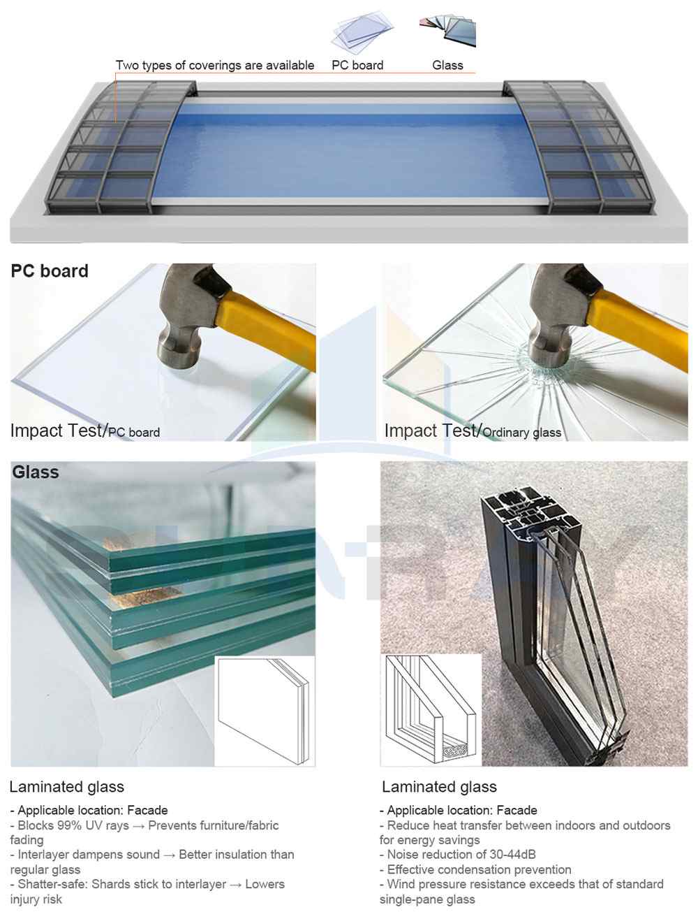 Choose between impact-resistant PC boards and safety laminated glass for your pool cover. Both options block UV rays, reduce noise, and provide superior insulation, ensuring a safe, comfortable, and durable space year-round.