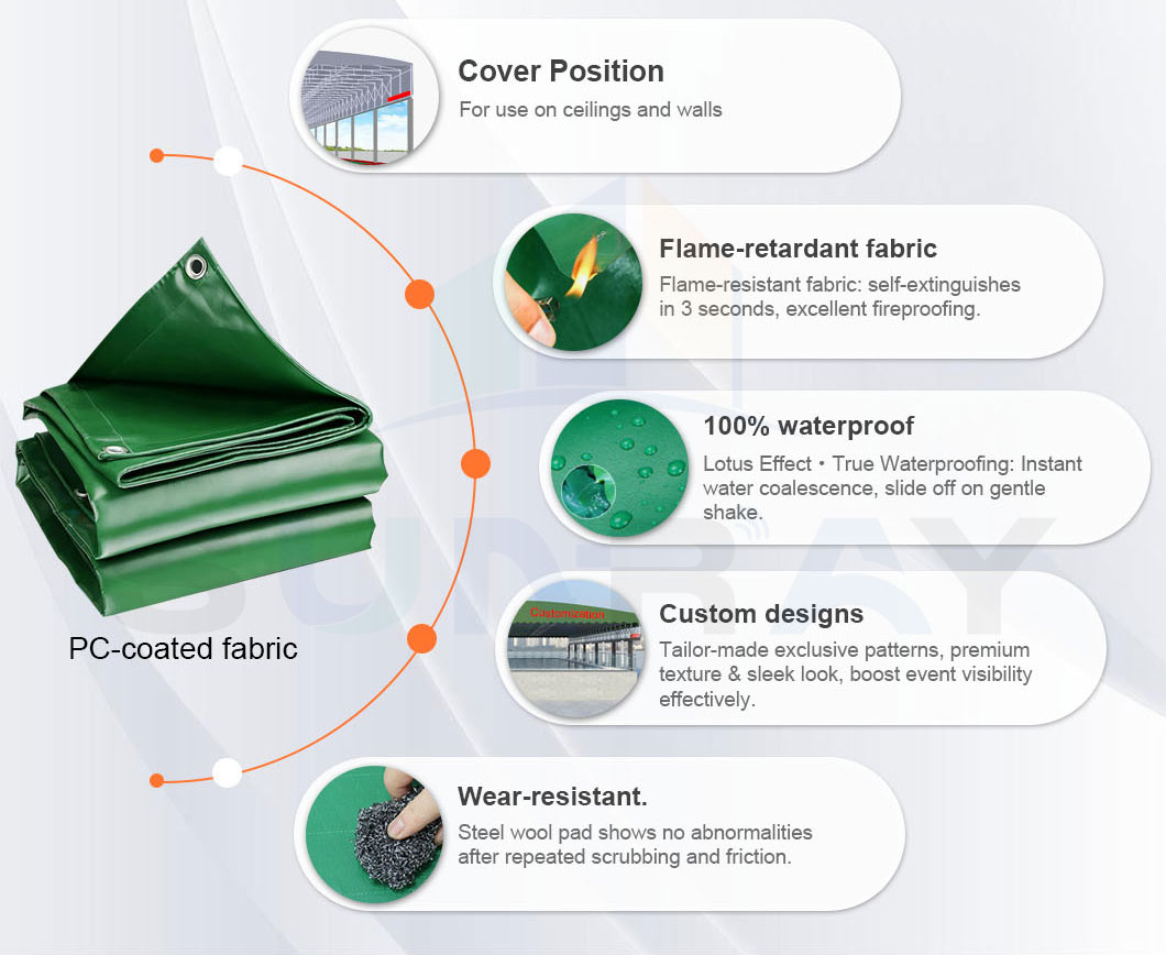 This PC-coated fabric is flame-retardant, 100% waterproof, and highly wear-resistant. It can be used for ceilings and walls, with custom designs available to boost visibility while delivering reliable, long-lasting performance.
