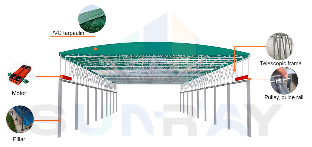 Crafted with heavy-duty PVC tarpaulin, a high-torque motor, and a telescopic frame paired with smooth pulleys. Reinforced pillars ensure unshakable stability, delivering seamless operation and long-lasting protection for outdoor areas.