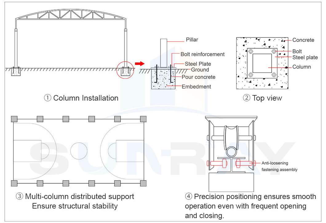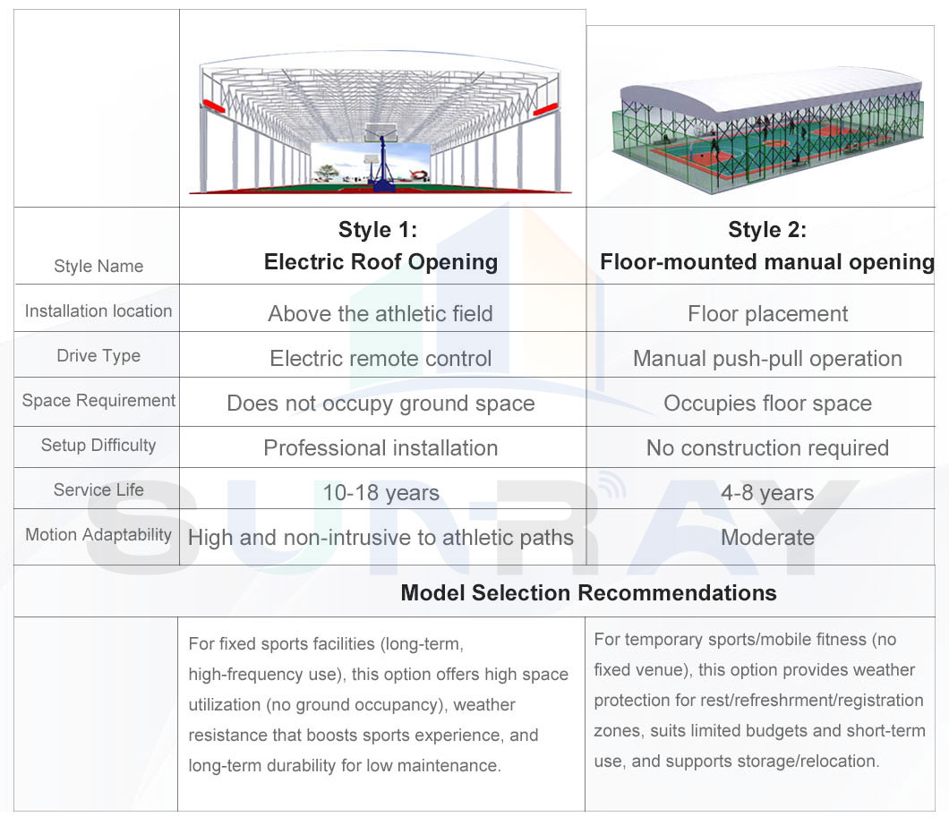 Choose between electric roof opening (ideal for long-term, high-frequency use with zero ground occupancy) and floor-mounted manual opening (perfect for temporary, mobile setups). Both deliver reliable weather protection, matching your space and budget.