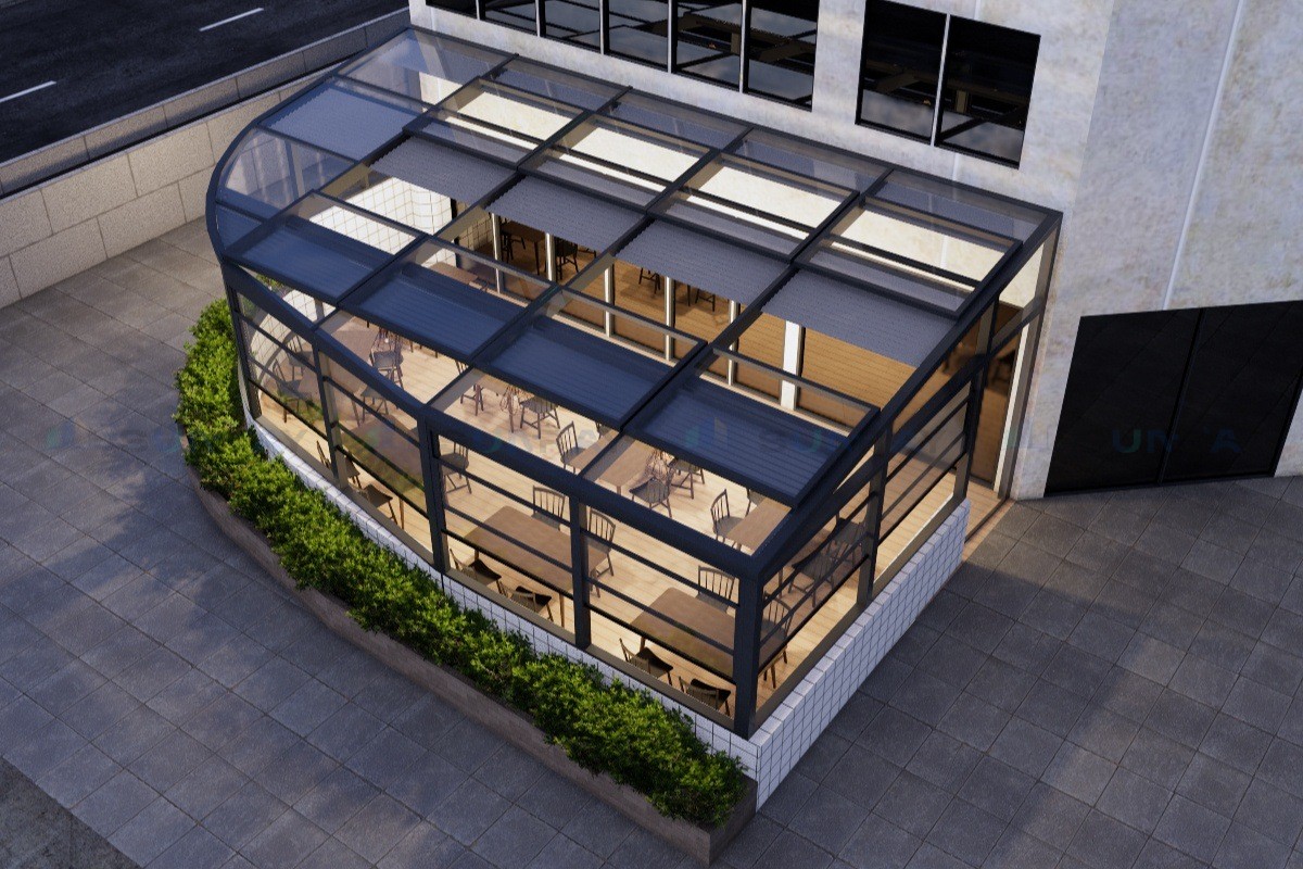 In a Canadian business district, sunray successfully created a year-round sunroom outdoor restaurant that perfectly solves the problem of seasonal business restrictions. The project is located in the outdoor area next to the commercial building, which was originally an open-air dining area, and the owner wanted to transform it into an enclosed dining space that is both airy and comfortable, in order to enhance the customer experience and extend the business hours.
