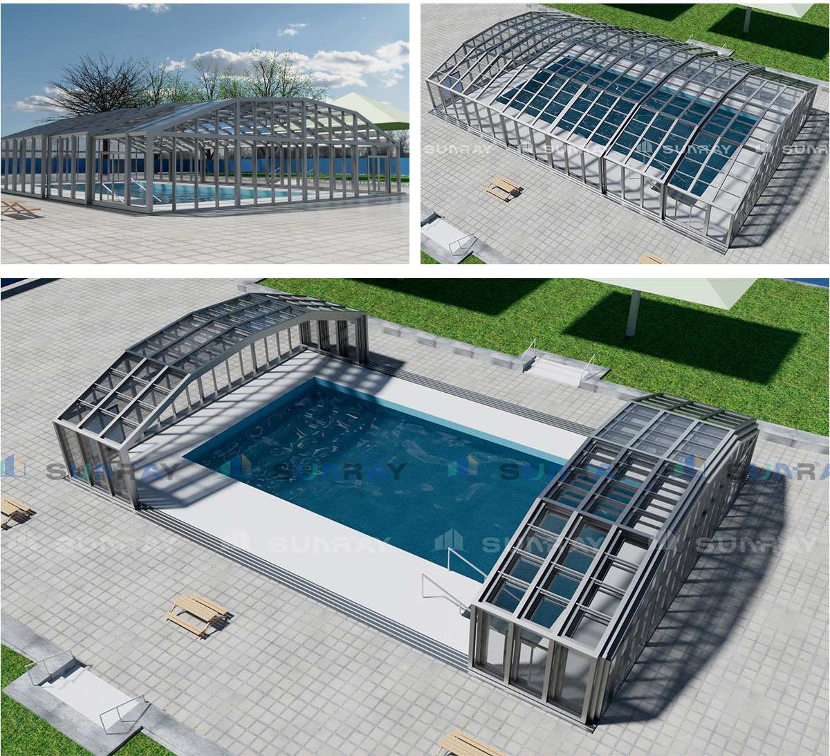 This tailored motorized sunroom is designed exclusively for public swimming pools across the Middle East, built to adapt to the region’s typical climate: year-round strong sunlight, distinct wet and dry seasons, hot dry summers, mild low-rain winters, high coastal humidity and low inland desert humidity. It delivers all-weather pool coverage, stable structural performance and cost-efficient cross-border delivery, fully complying with local public facility safety standards for high-sunlight arid regions.