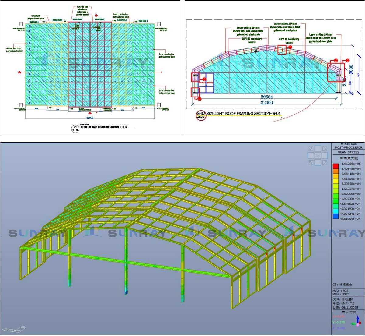 Built with black 6063-T6 high-strength aluminum alloy (110×250×8.0mm), joints reinforced with 15mm thick steel plates. Structural stress analysis adapted to local wind and sand conditions ensures superior load-bearing and wind resistance; the multi-arch design boosts overall stability against regional sandstorms and strong winds.