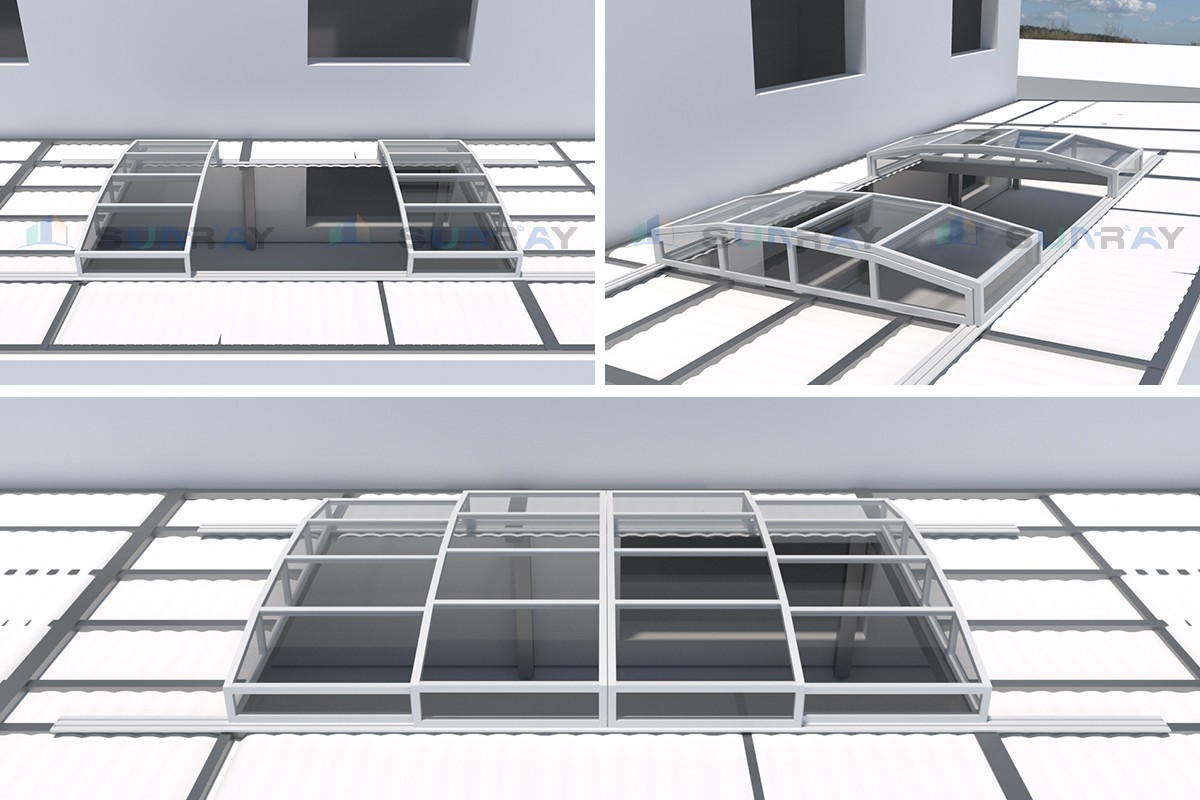 The indoor roof of a swimming pool in the backyard of a villa meant building a mobile sunroom on the client’s steel structure. The price of glass was too high, so the client chose polycarbonate panels with uv coating. T6 profile was required.