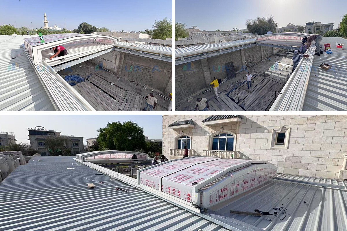 Site condition:The local climate is above 40 degrees, very hot, little wind and dusty. The project is in the backyard of the villa, the product size 9208*6145mm,extension track 2340mm on each side, the track are installed on the steel structure. Workers installed for the first time, communication language barriers, but due to modular installation, the degree of installation is simple.