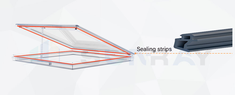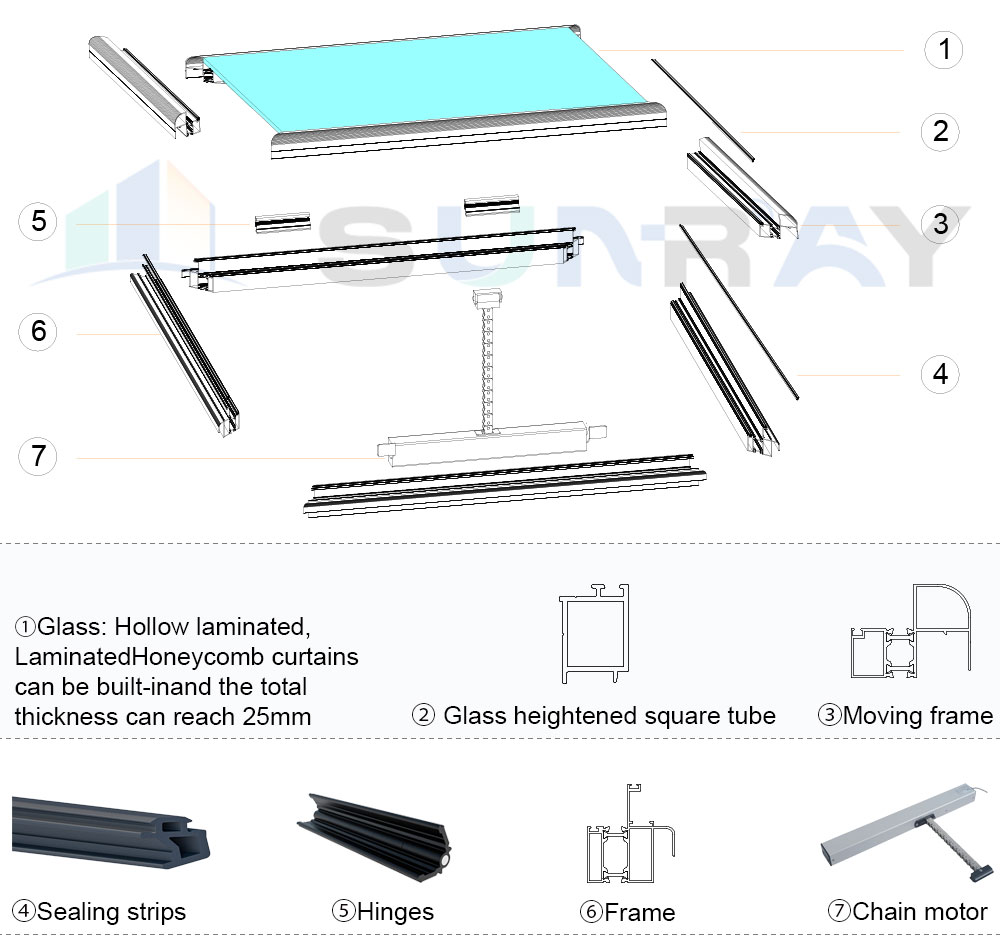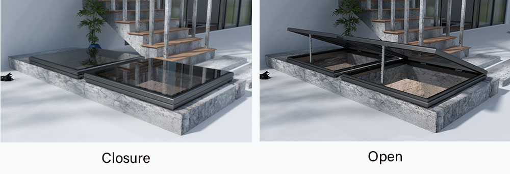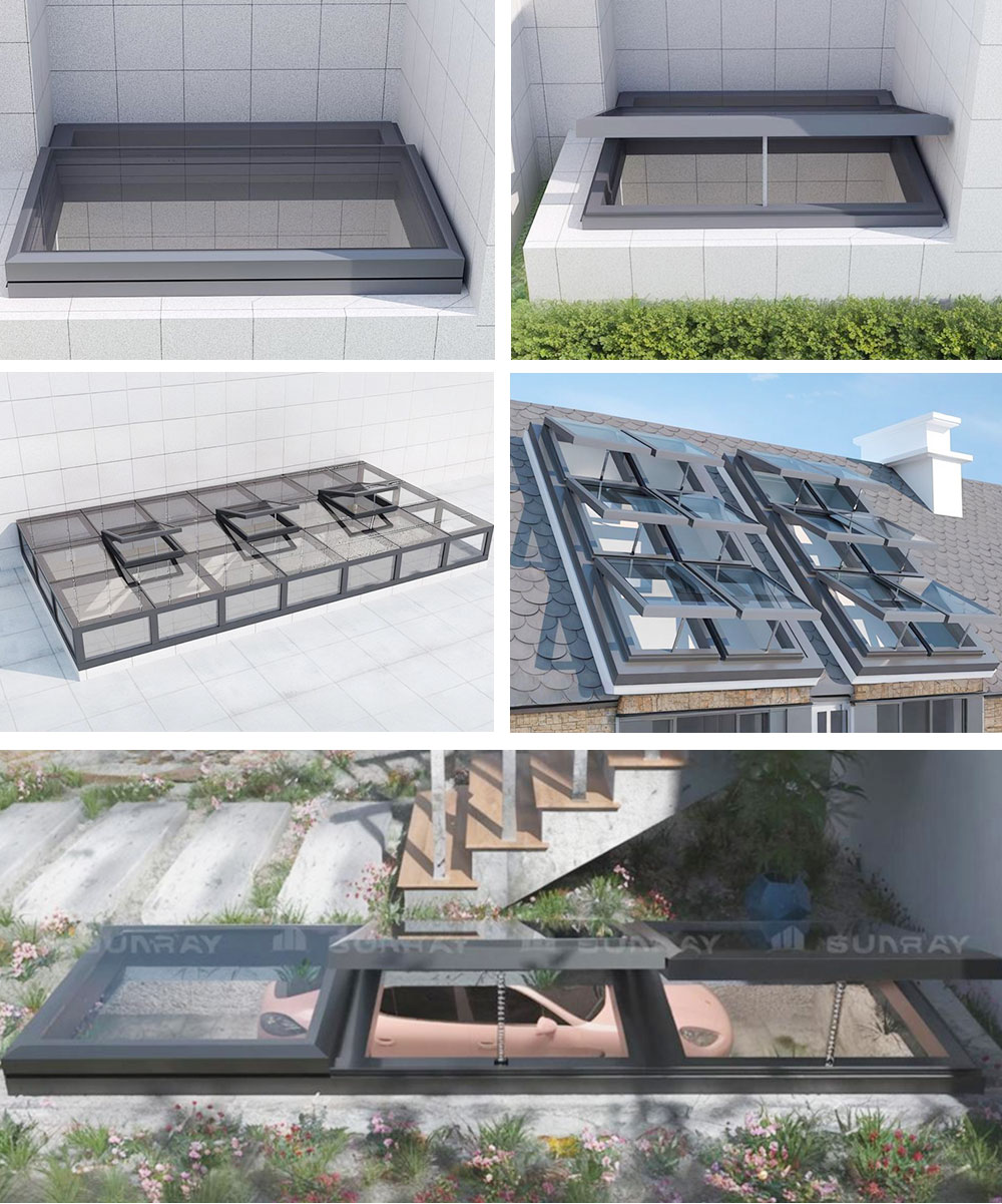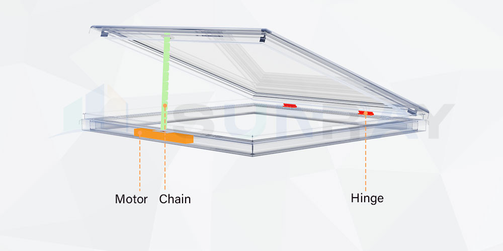 The skylight is opened and closed by a motor-driven chain. The motor drives the chain to move the skylight panel up or down to open and close. The control system supports manual or automatic operation and is equipped with limit switches and emergency stop functions to ensure safe operation.